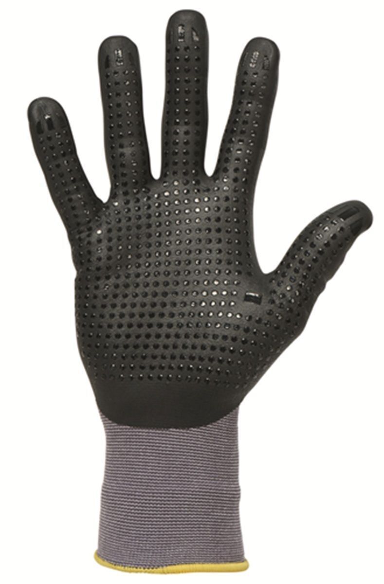 - Pour un grip infaillible, des picots en nitrile ont été ajoutés sur la paume et l'intérieur des doigts, garantissant une prise en main sécurisée même en milieu glissant