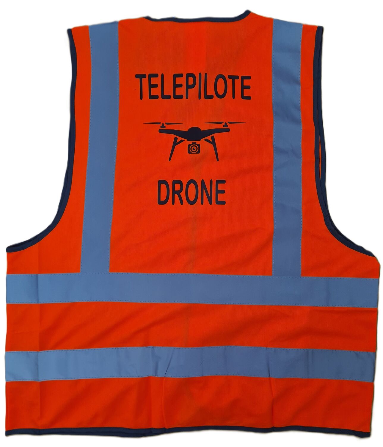 Gilet de sécurité orange fluo avec marquage au dos dans nos ateliers en FRance (marquage flex noir) : TELEPILOTE DRONE illustré d'un drone