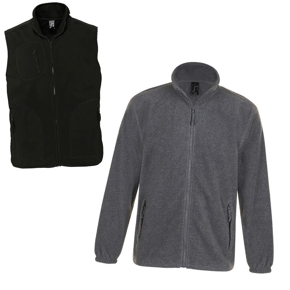 Lot 2 gilets polaires zippés unisexe - noir et gris - avec et sans manches