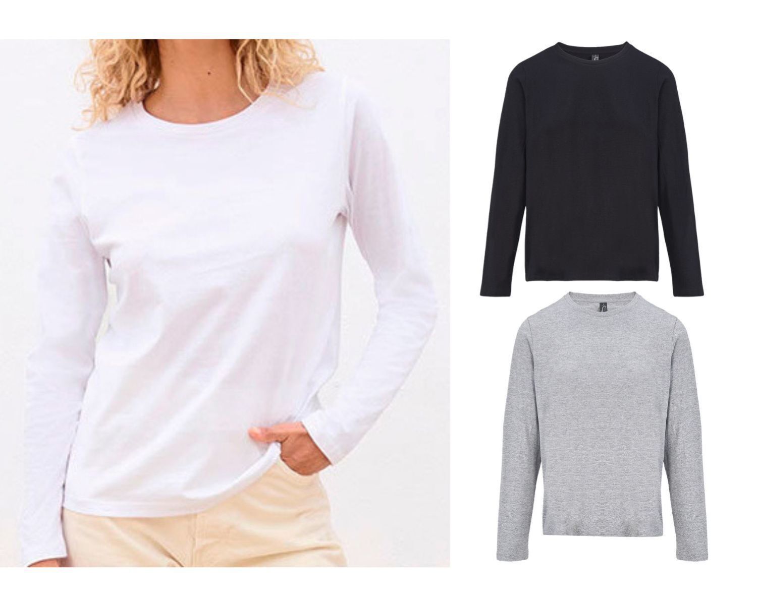 Lot de 3 T-shirts manches longues pour FEMME : 1 t-shirts blanc, un t-shirt gris chiné et 1 t-shirt noir